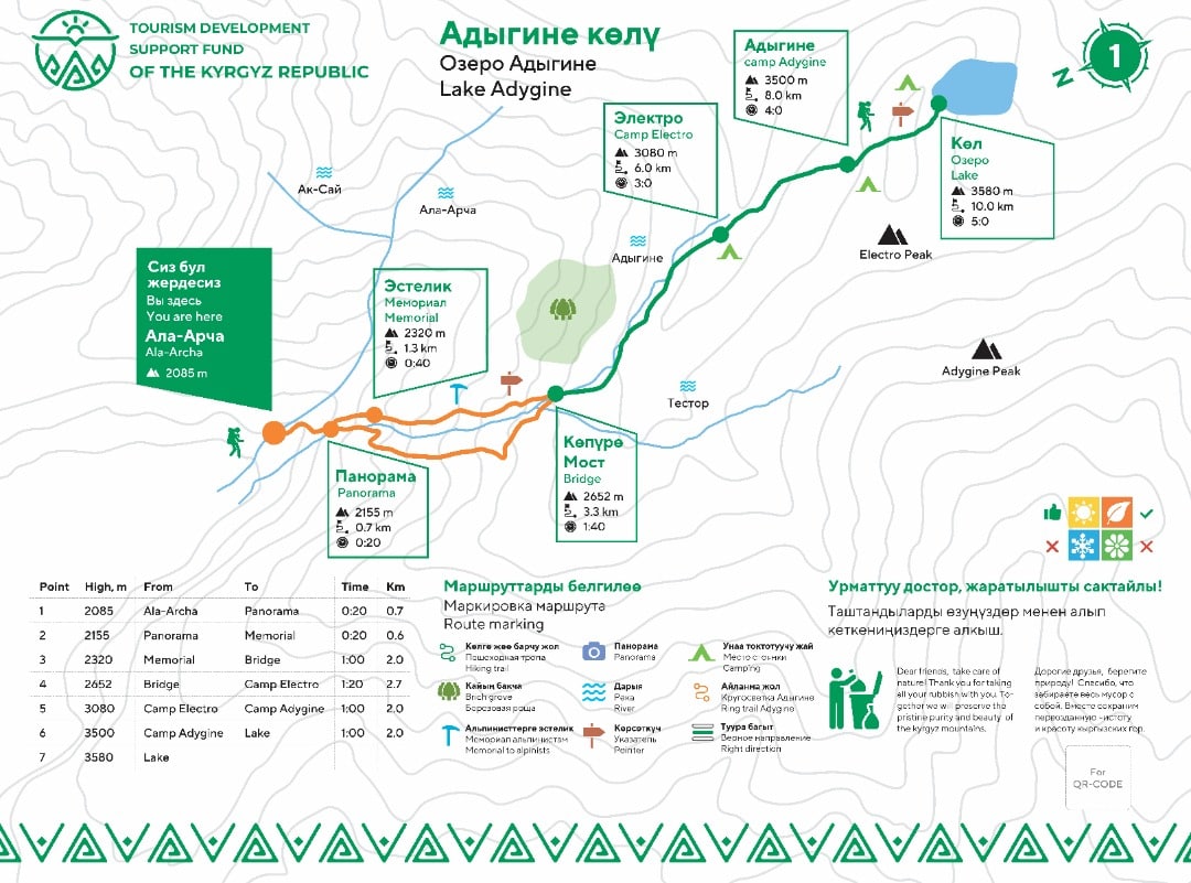 Теперь на всех маршрутах имеется инфонавигация на трех языках – кыргызском, английском и русском. Туристы могут получить сведения о приблизительном времени прохождения тропы, промежуточных точках и расстоянии между ними, о высоте, на которой они находятся. Кроме того, вдоль в каждой тропы установили указатели правильного движения.