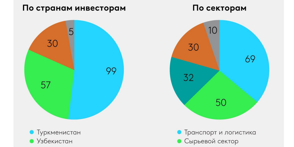 - Крупнейшим инвестором является Туркменистан с объемом вложений около $100 млн. Ключевой проект: газопровод Туркменистан-Афганистан-Пакистан-Индия (ТАПИ), инвестиции в афганский участок начались в 2024 г. Также Туркменистан финансирует строительствожелезной дороги Акина-Андхой в рамках Лазуритового коридора.