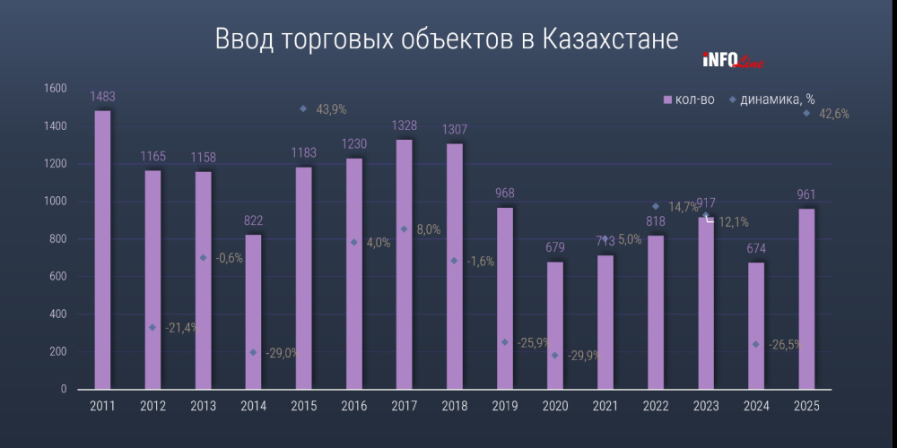 В 2025 году рынок торговой недвижимости Казахстана перешел к фазе активного роста: объемы ввода и инвестиций достигли рекордных значений за последнее десятилетие, при этом, несмотря на сохраняющееся доминирование развития на территории Алматы и Астаны, развитие сегмента все заметнее выходит и за их пределы. По официальным данным, в 2025 году был введен в эксплуатацию 961 торговый объект (супермаркеты, минимаркеты, торговые дома, ТРЦ и др.), в 2024-м – 674, а в 2023-м – 917.