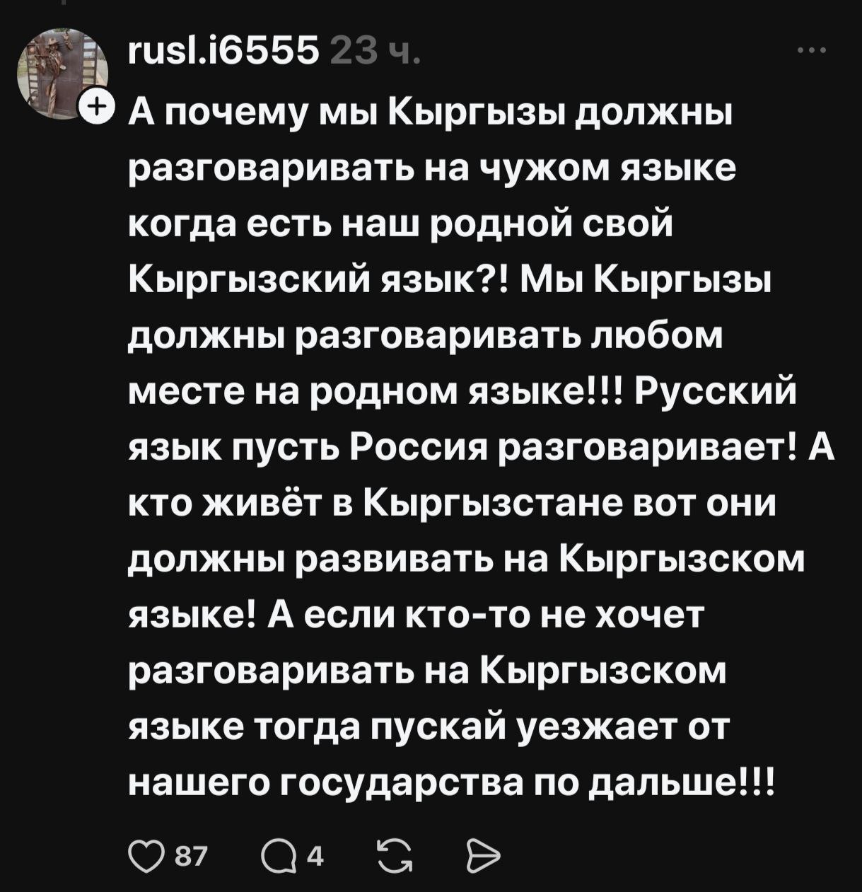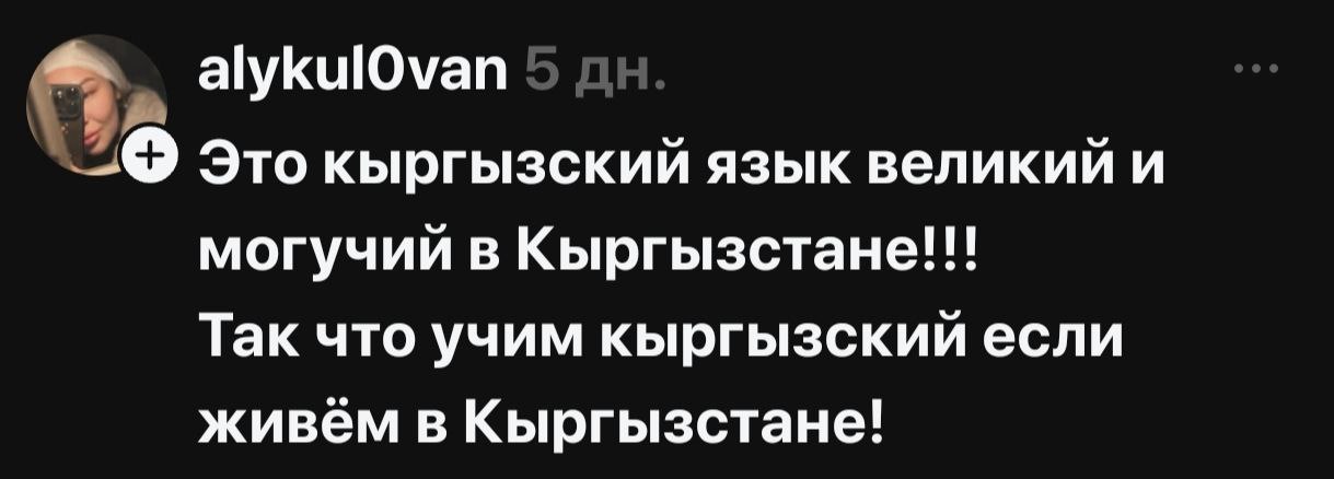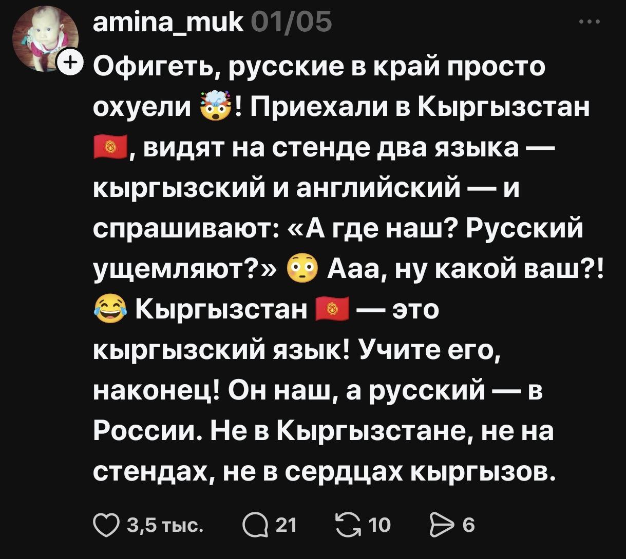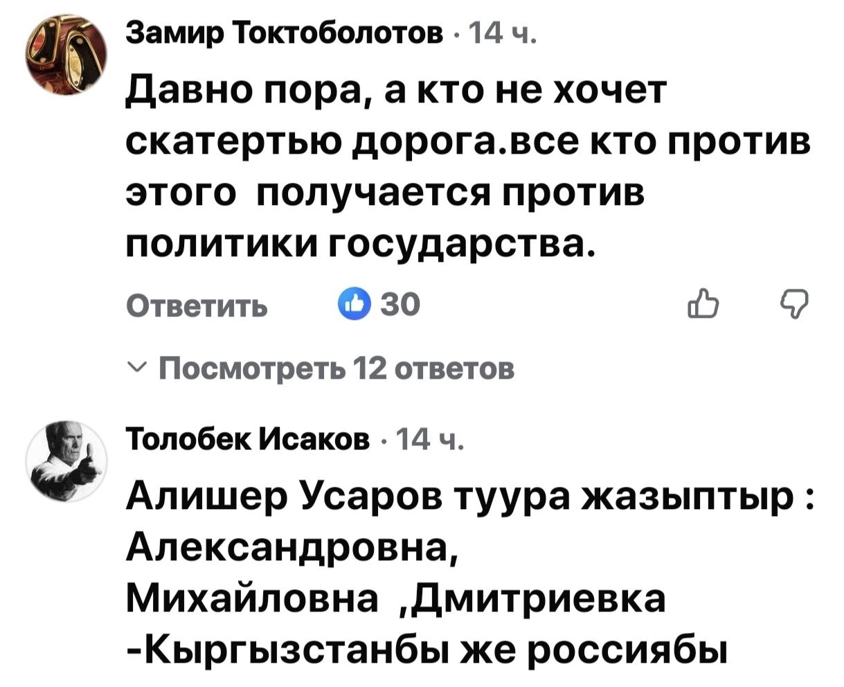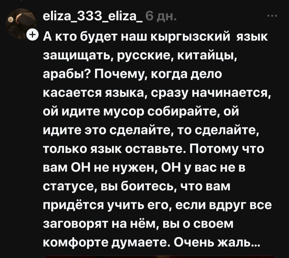 В соцсетях началась жаркая риторика, разделившая народ на два лагеря — на тех, кто считает русский опасным архаизмом, и тех, кто его поддерживает и считает языком межнационального общения. По сути, языковая тема, возможно, как и планировалось, дала серьезную трещину в межнациональном обществе Кыргызстана.