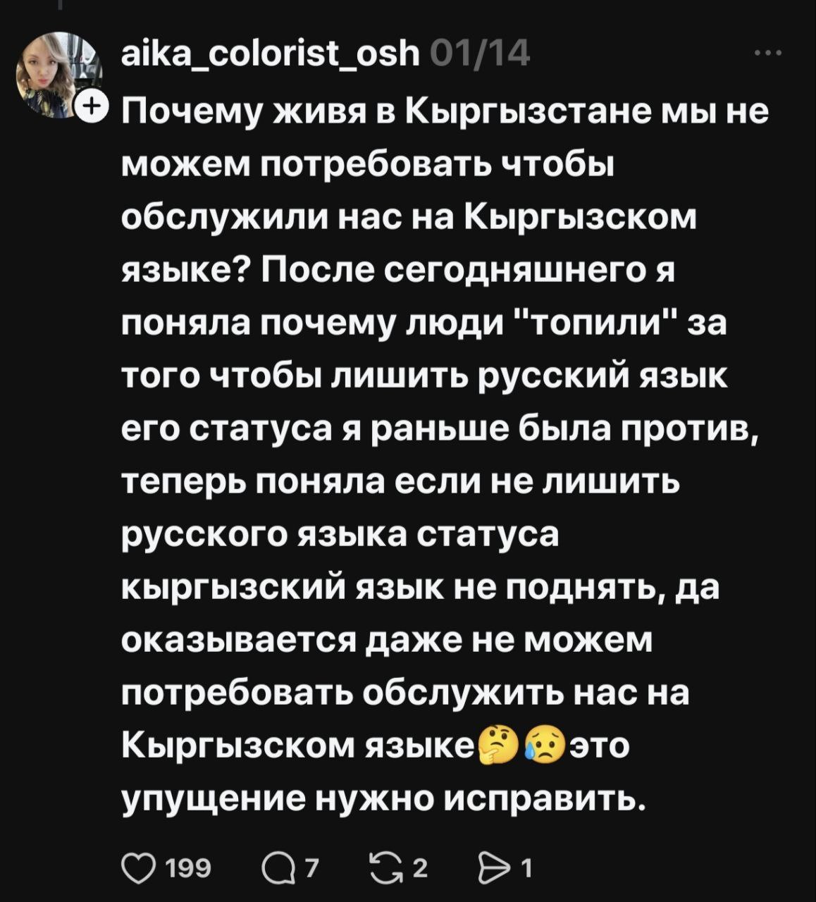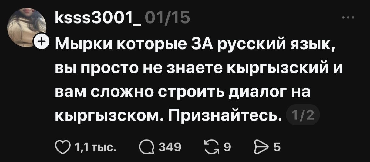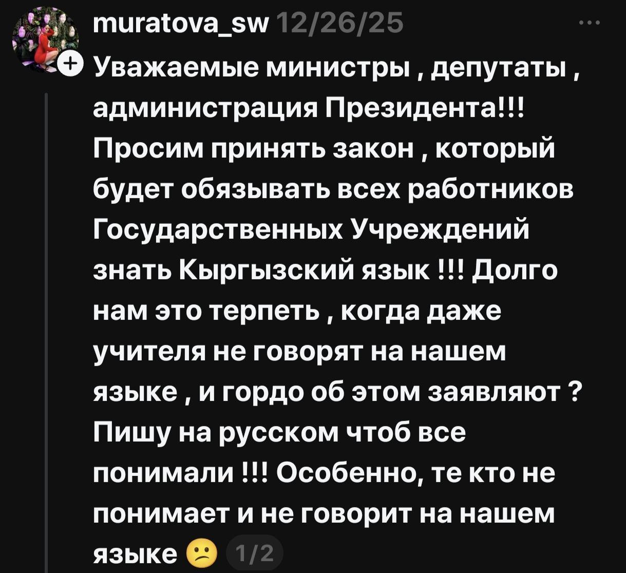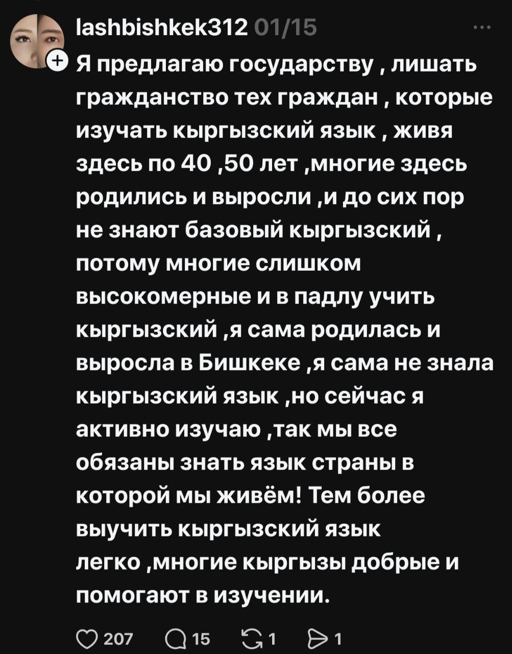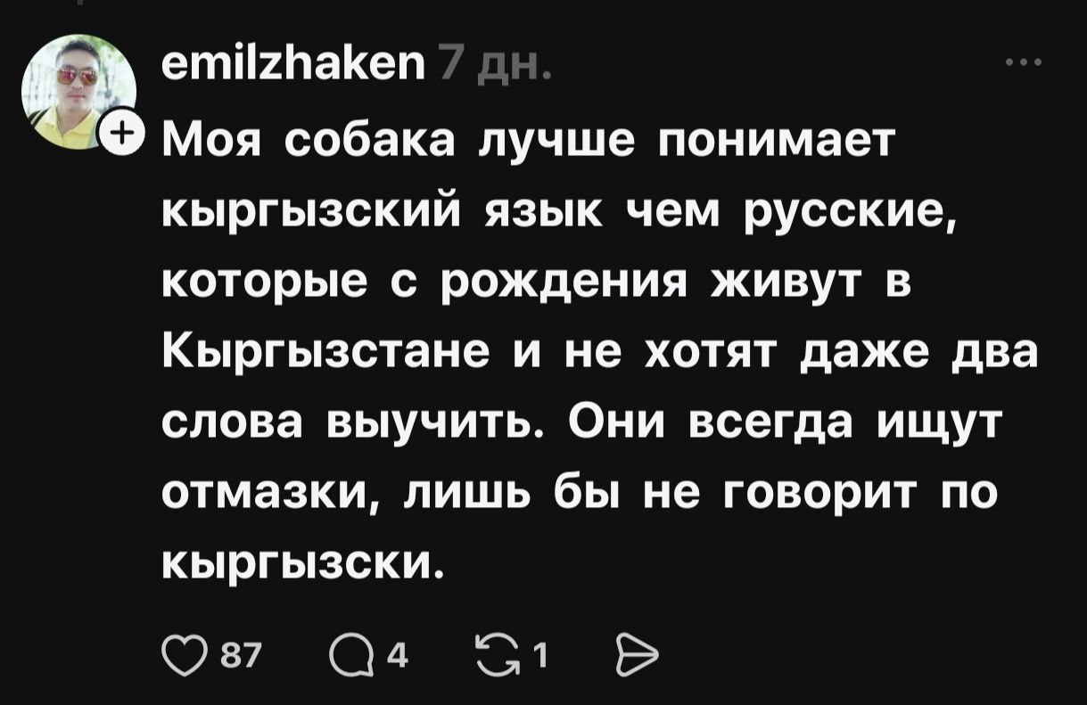 В соцсетях началась жаркая риторика, разделившая народ на два лагеря — на тех, кто считает русский опасным архаизмом, и тех, кто его поддерживает и считает языком межнационального общения. По сути, языковая тема, возможно, как и планировалось, дала серьезную трещину в межнациональном обществе Кыргызстана.