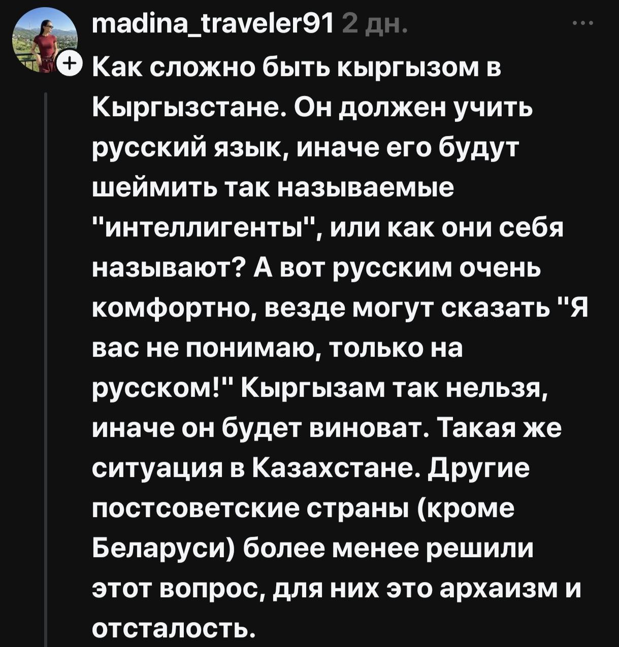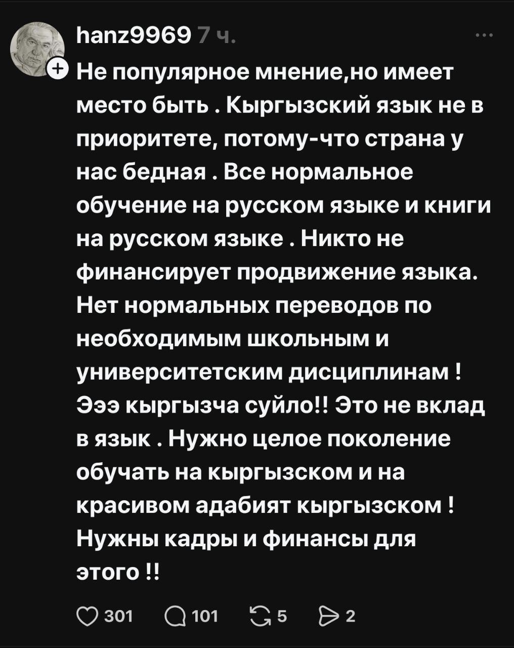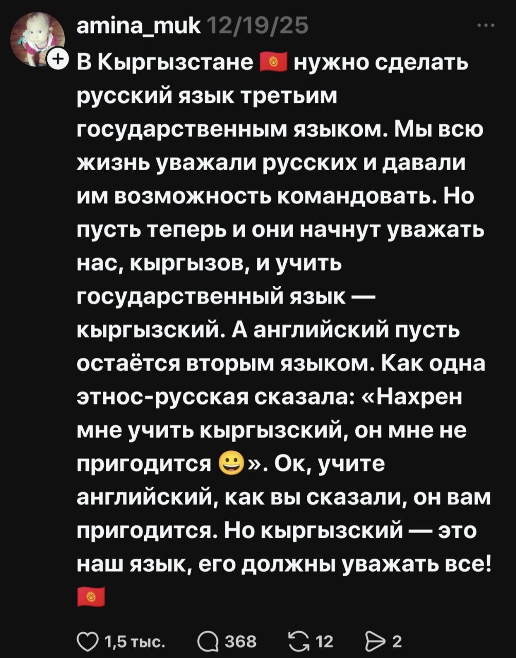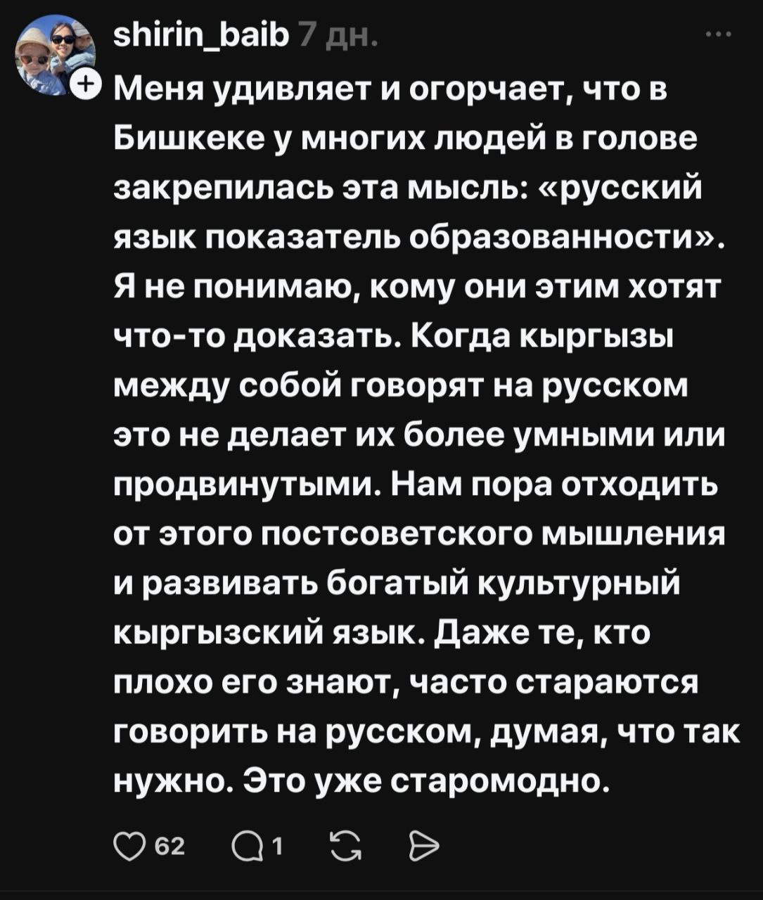 В соцсетях началась жаркая риторика, разделившая народ на два лагеря — на тех, кто считает русский опасным архаизмом, и тех, кто его поддерживает и считает языком межнационального общения. По сути, языковая тема, возможно, как и планировалось, дала серьезную трещину в межнациональном обществе Кыргызстана.