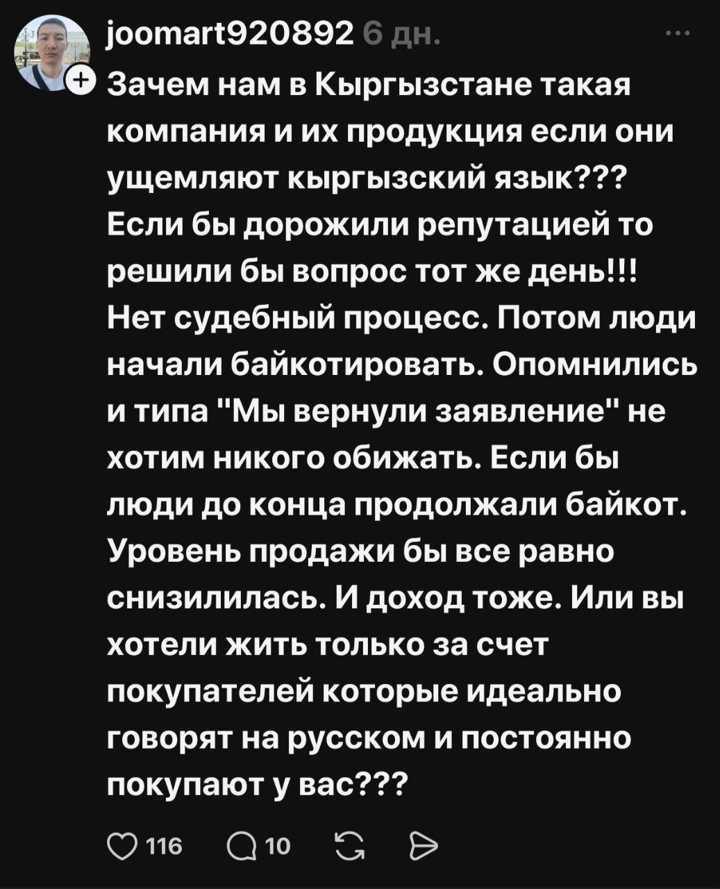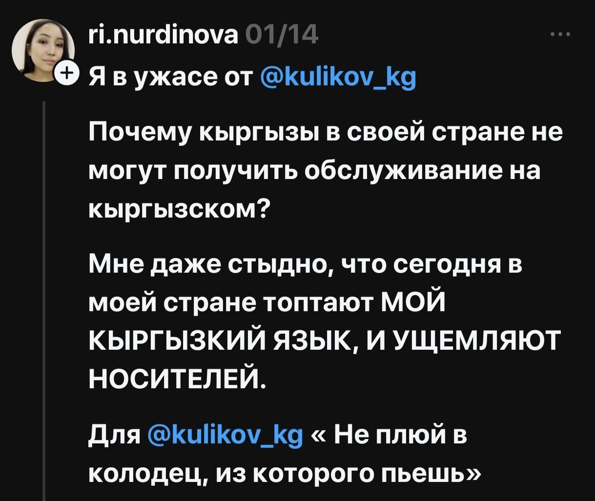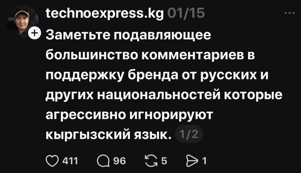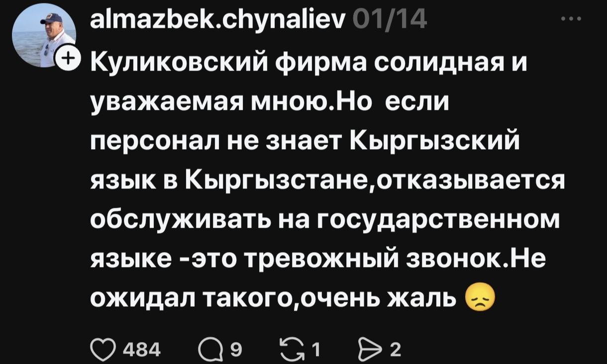 Затем туда заглянул блогер Актилек Орозбеков, который неоднократно был замечен в организации «языковых патрулей» по примеру Казахстана и Украины. На этот раз ему не понравилось обслуживание «кыргызча», и он устроил провокацию в адрес персонала компании. Ситуация усугублялась тем, что на «помощь» националисту пришли фейки, замеченные в работе с бот-фермой нынешнего главы пресс-службы Аппарата президента КР Дайыра Орунбекова. Совпадение это или целенаправленная команда — сказать сложно. Главной темой их комментариев стала тема госязыка и «вредительство» официального. Поддерживали лидера языковых патрулей и отдельные депутаты ЖК. В итоге компании пришлось пойти на примирение с Орозбековым, и прецедент по ущемлению официального языка был создан под громкие аплодисменты местных национал-патриотов.