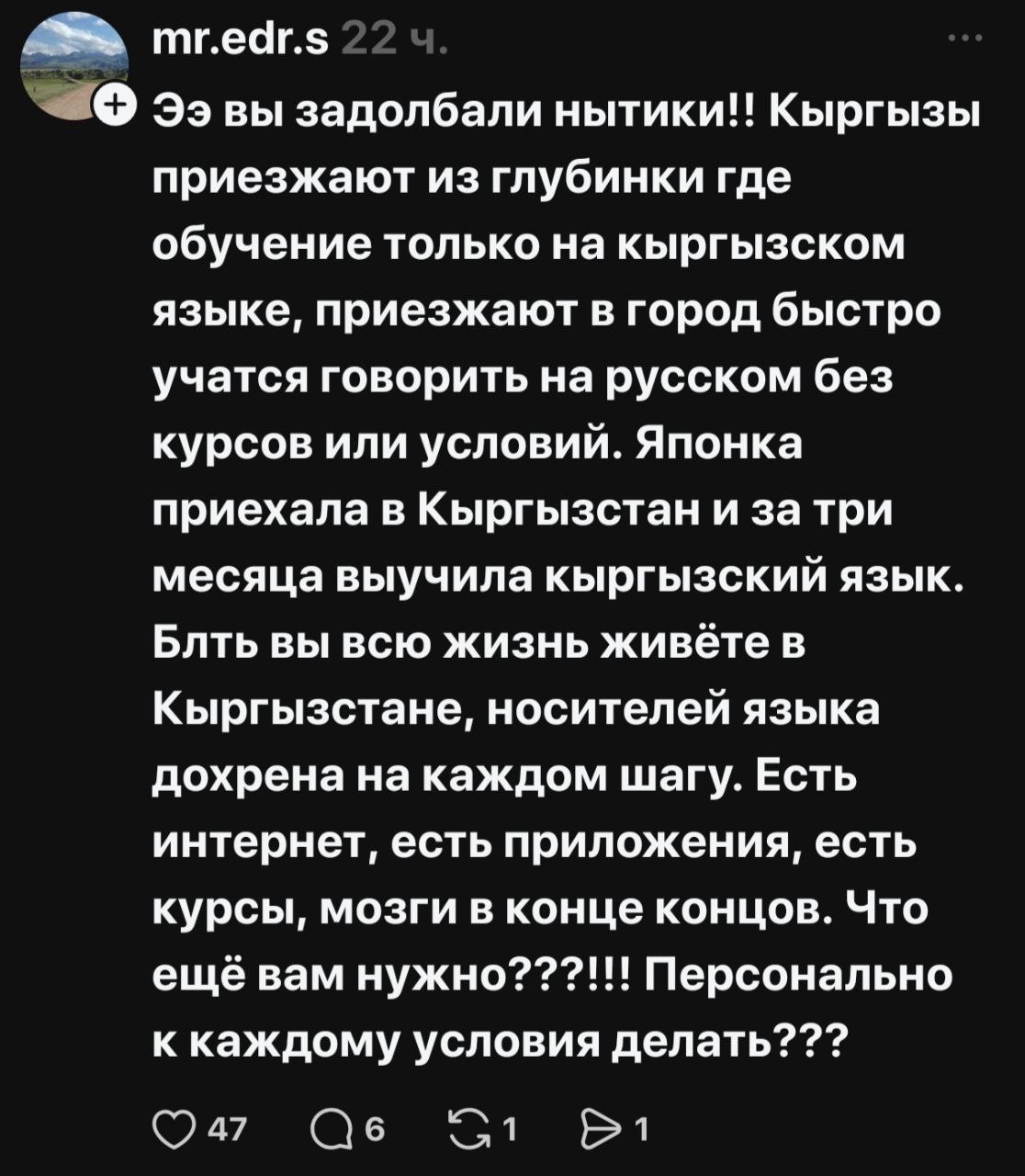 В последнее время в Кыргызстане на повестку дня межнационального спокойствия встал так называемый «ура-национальный» вопрос. Камнем преткновения между националистами и разумными гражданами республики всегда была тема использования государственного языка. Вторые понимают, что двуязычие страны, сформировавшееся в начале независимости, — это бонус для граждан, а не проблема, и что развивать государственный язык необходимо. Но для этого нужно выделять финансирование, создавать различные грамотные курсы по его изучению, а не ущемлять языки межнационального общения по принципу: «Эээ, кыргызча суйло!».