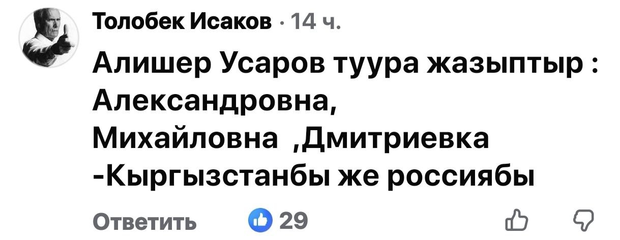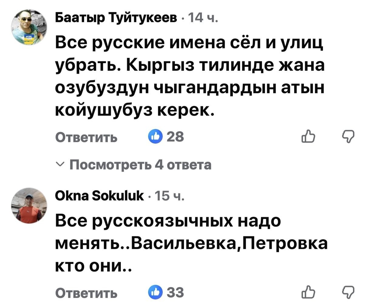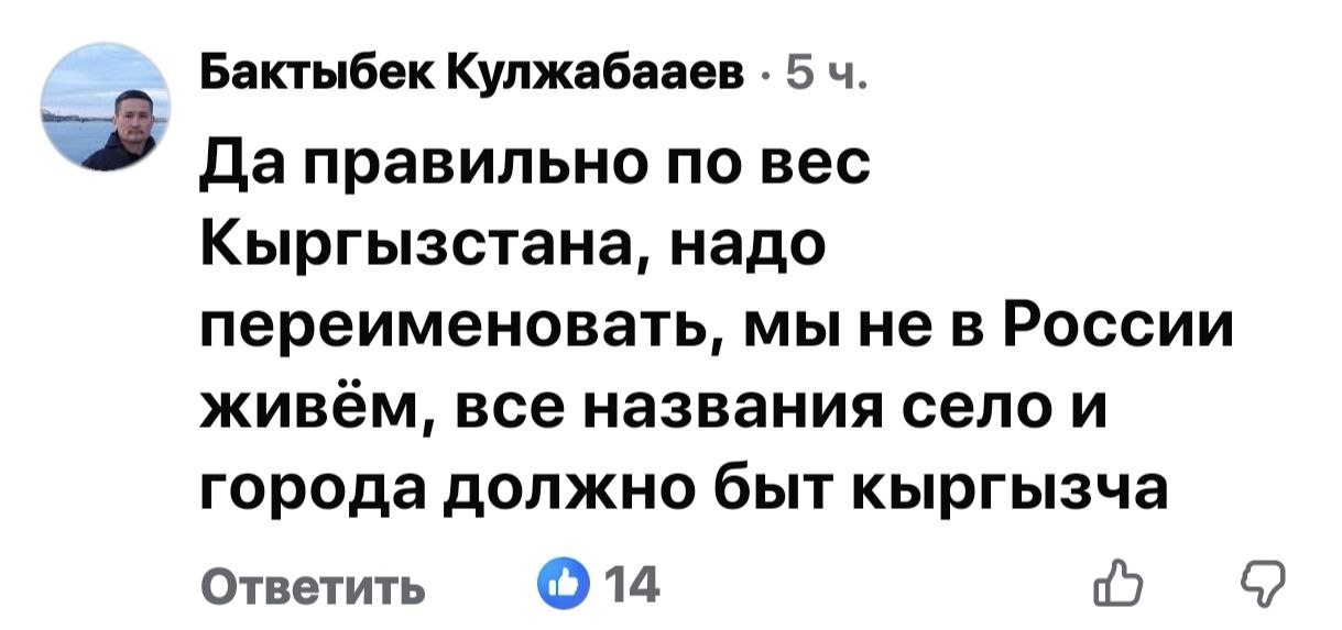 Однако «ура-националисты» на этом не остановились и развернули в соцсетях новую кампанию — по переименованию советских (русских) названий сел и районов Бишкека и Кыргызстана в целом. Особенно скандальным оказалось видео, которое появилось в соцсетях. Речь идет о собрании в айыл окмоту Иссык-Атинского района Чуйской области. Ее местные представители заявили об инициативе по переименованию села Дмитриевка в село Эсиркемиш. Особенно выделяется на этом фоне заявление одной из представителей айыл окмоту этого села: «Кто такой этот Дмитриев? Он пришел сюда, убивал мой народ, а его именем назвали село!». Причем до этого она сама же заявила, что понятия не имеет, в честь кого было названо место ее нынешнего проживания. Однако не побоялась необоснованно обвинить русскоязычное население чуть ли не в геноциде кыргызов. И это лишь один из подобных примеров.