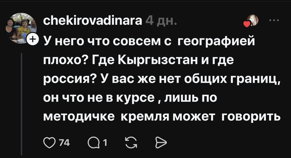 На фоне этого в различных местных пабликах и каналах стали появляться вбросы и нейровидео от, якобы, депутатов РФ или представителей ее экспертного сообщества о необходимости ведения СВО на территории стран Средней Азии, включая Казахстан и Кыргызстан. Идут ли они от местных любителей ИИ или от внешних источников — сказать пока сложно. Но местные «нацики» подхватывают их и раздувают на них хайп.