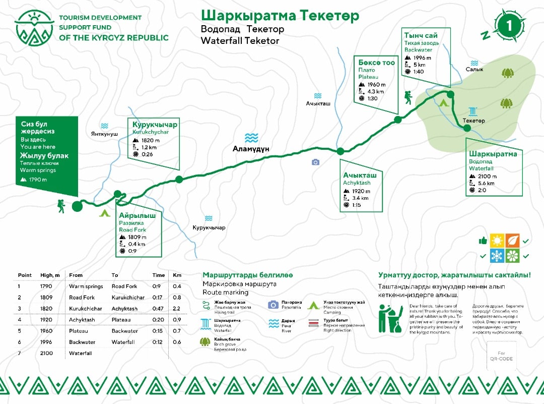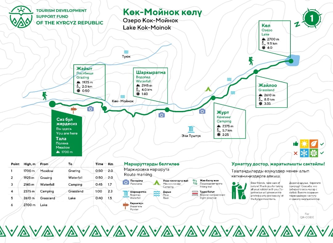 Теперь на всех маршрутах имеется инфонавигация на трех языках – кыргызском, английском и русском. Туристы могут получить сведения о приблизительном времени прохождения тропы, промежуточных точках и расстоянии между ними, о высоте, на которой они находятся. Кроме того, вдоль в каждой тропы установили указатели правильного движения.